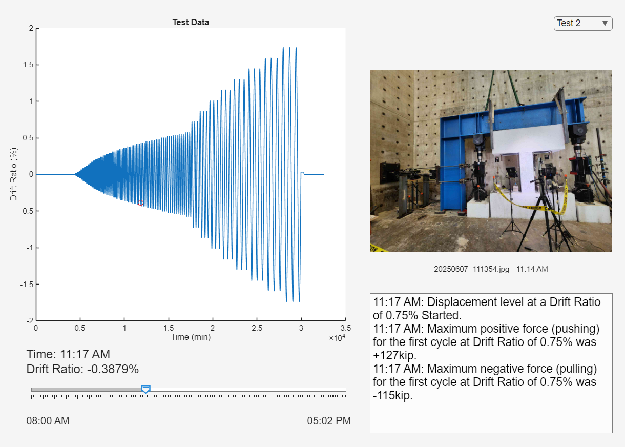 - Developed a MATLAB application for presenting displacement data, notes, and photos from tests (see details below)
